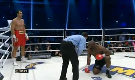 ça y est ! le combat est déjà terminé et Jean Marc MORMECK n’a pas pu faire face à l’extraordinaire Vladimir KLITSCHKO. C’est au 4° round que Mormeck est envoyé pour la n-ième fois au tapis, sauf que cette fois-ci il ne s’en est pas relevé. On a senti la vrai différence de poids et de taille entre les deux hommes. Il n’y a pas de regrets à avoir tellement la différence était importante. On ne pourra pas lui reprocher le courage qu’il a eu d’aller l’affronter.